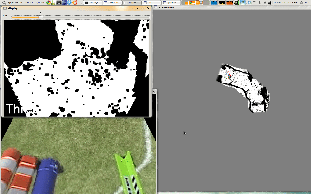 - The average of RGB ratios is used to threshold the transformed image in to a binary image of ‘traverse-able (white) or obstacle (black) . This image is mapped into a world space using a homography matrix.
