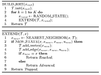 The basic RRT algorithm is given above. Each iteration of construction attempts to extend the RRT by adding a new vertex that is biased by a randomly-selected state x_{rand}. The EXTEND function selects the nearest vertex already in the RRT x_{near}, and applies a valid motion towards the randomly selected state input, creating a new node to be added to the RRT x_{new} [cite](LaValle 2001). This biases the RRT to rapidly explore the state space.
